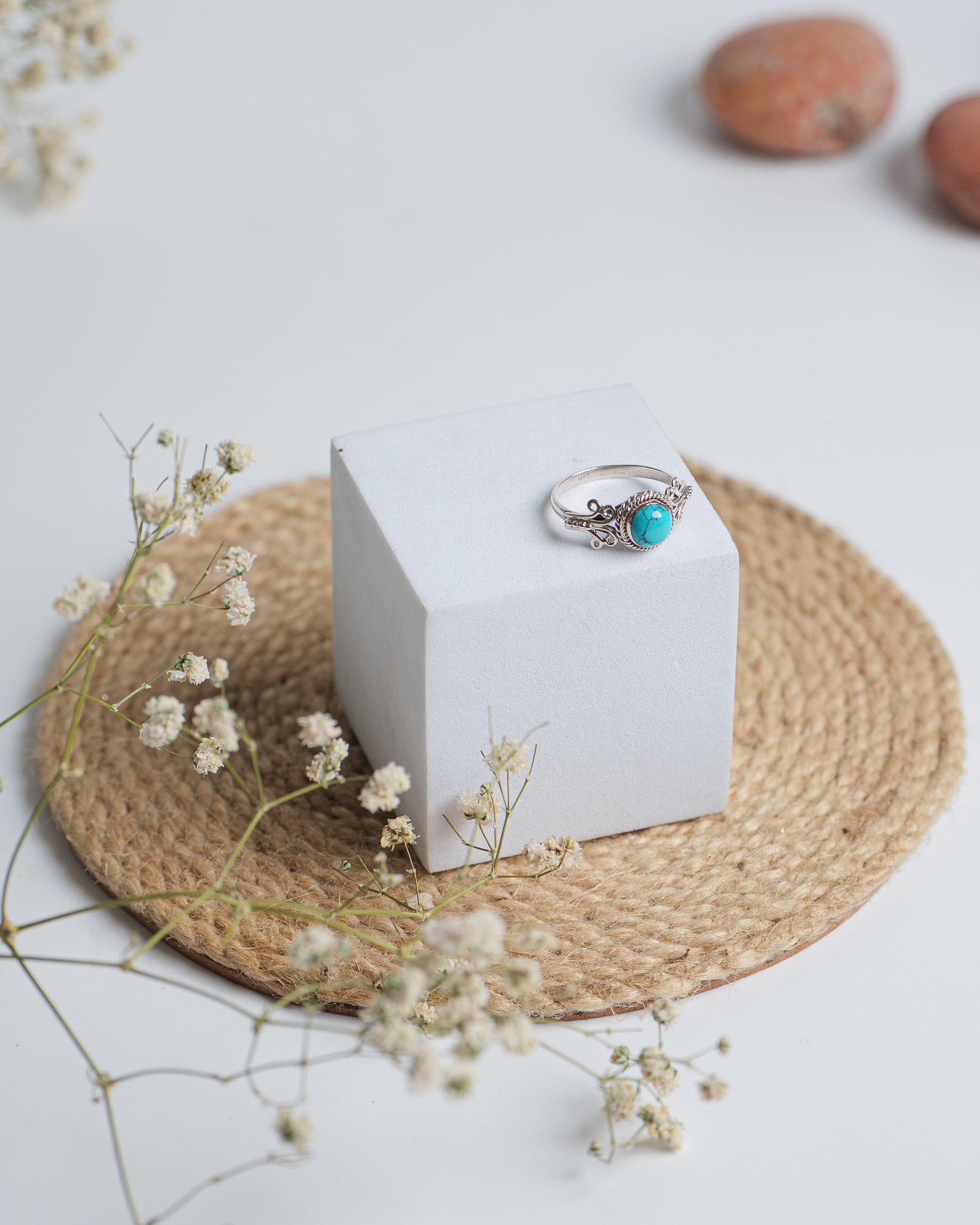This exquisite ring features a beautifully carved turquoise stone set in 925 silver, making it a unique and eye-catching accessory.
